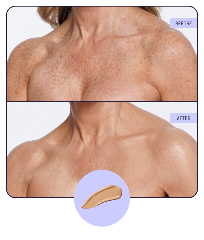 No, this is not your typical body makeup! Body Coverage Perfector is a lightweight, easy-to-blend formula that layers beautifully if you need fuller coverage. It dries down to a weightless, skin-like finish — leaving behind a perfected yet natural-looking glow.