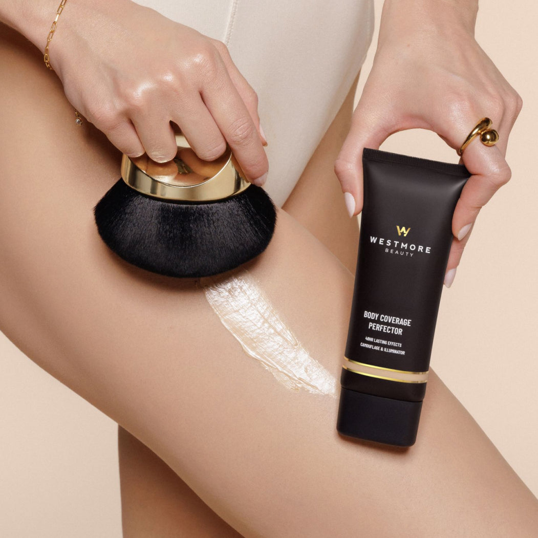 Apply Body Coverage Perfector liberally onto the area you'd like to perfect, using hands or a body brush, blend in an upward and outward motion. Allow the product to dry for 10 mins, and if needed apply additional layers for more coverage allowing each to dry for 10 mins.