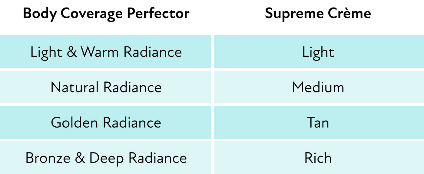 Our Body Coverage Perfector is formulated to be used on the body and has a radiant finish, with medium to full coverage. Supreme Crème can be applied to both face & body and has a natural finish, with light to medium coverage. Both products are great for layering and are waterproof, sweatproof, and transfer-resistant. Supreme Crème is longwear up to 12 hours, while with Body Coverage Perfector you get up to 48 hours of wear.